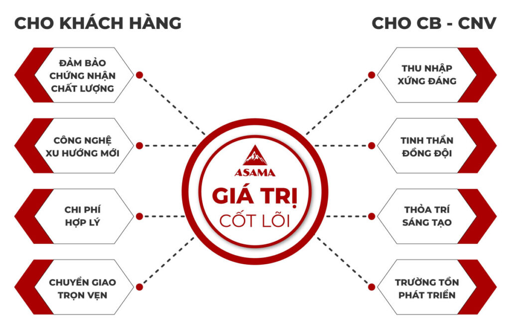 Đối Với Công Ty : Lòng biết ơn – Chất Lượng – Sáng Tạo – Đoàn kết – Trách Nhiệm – Không Sợ Thay Đổi – Chia sẻ bền vững.